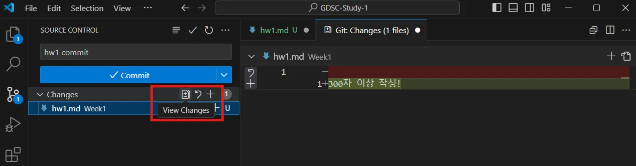 Commit 전 Changes 옆의 View Changes 버튼을 누르면 변경된 내용을 볼 수 있어요!