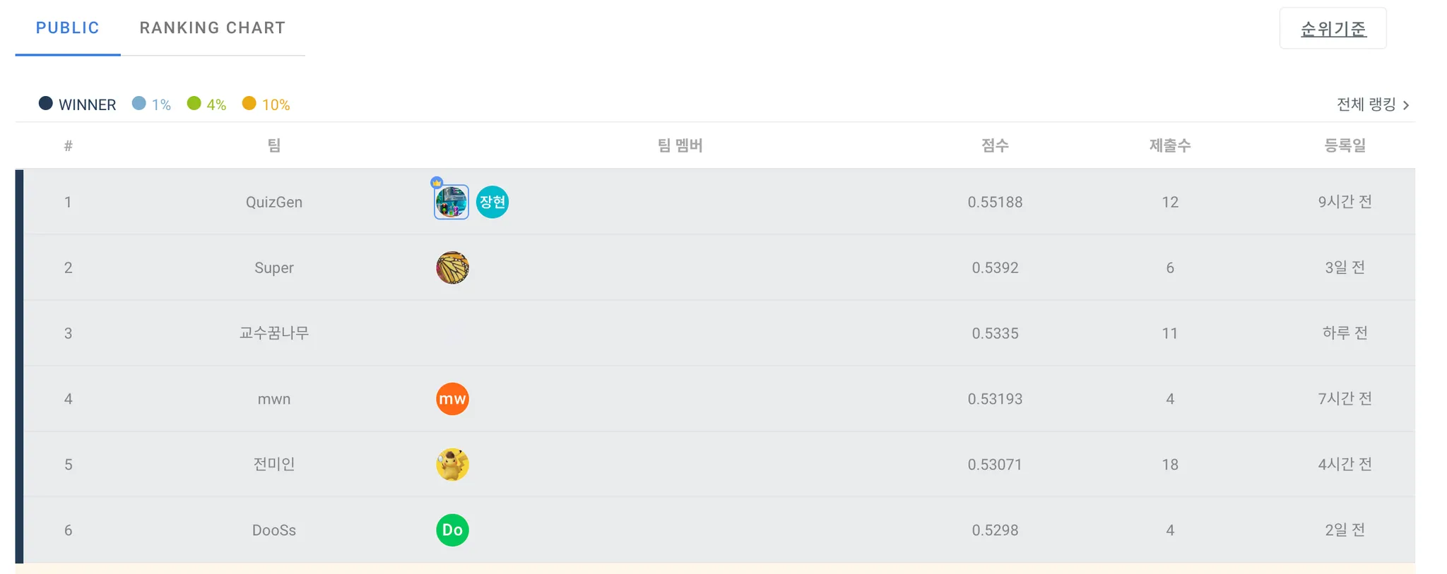 보통 이런 대회에서는 데이터셋을 제공하고, 다음과 같이 리더보드를 띄워서 랭킹을 확인할 수 있게 해줍니다.