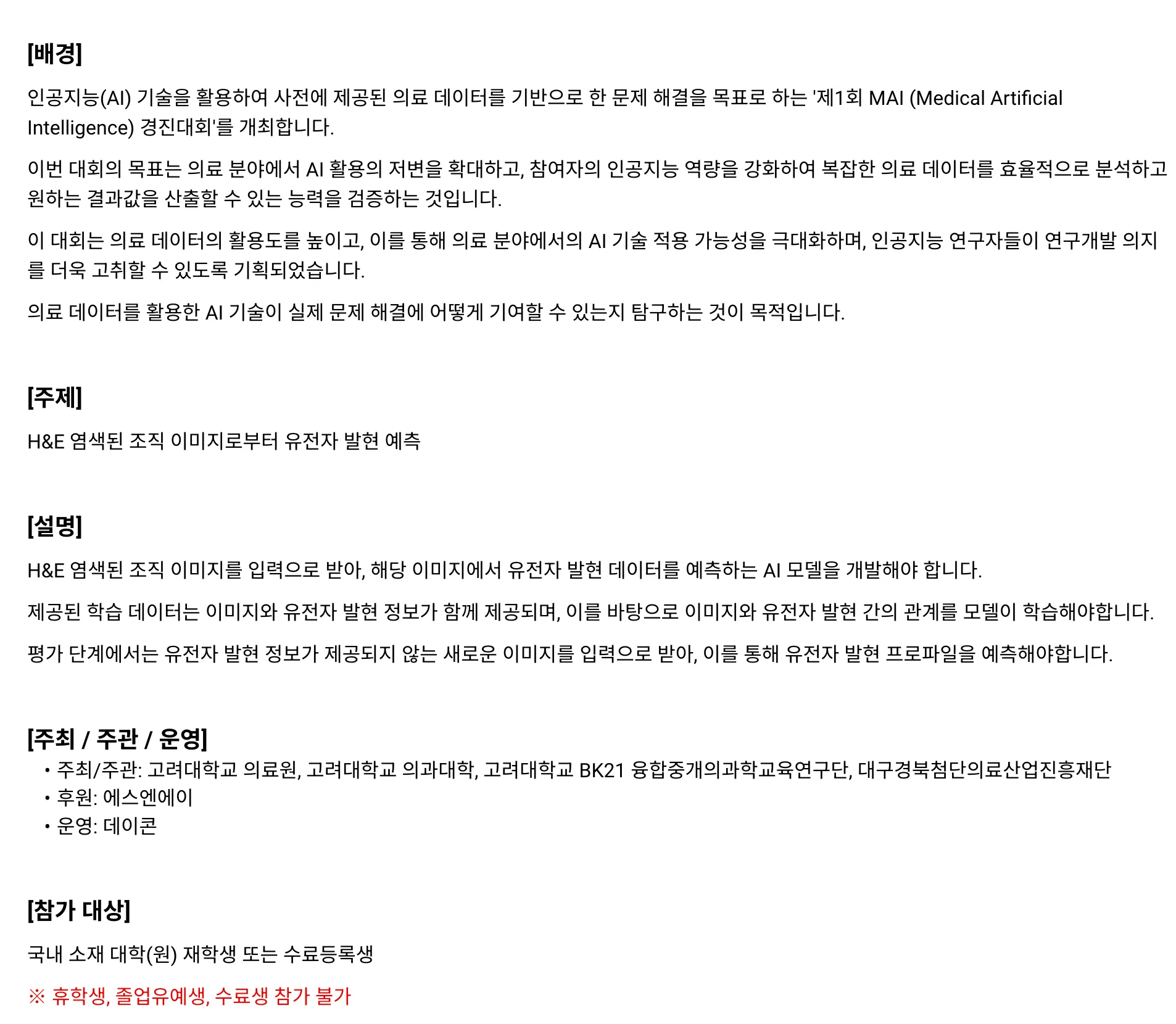 이 대회의 경우 H&E 염색된 조직 이미지를 입력으로 받아서 해당 이미지에서 유전자 발현 데이터를 예측하는 AI 모델을 개발하는 문제를 푸는 것 같네요.