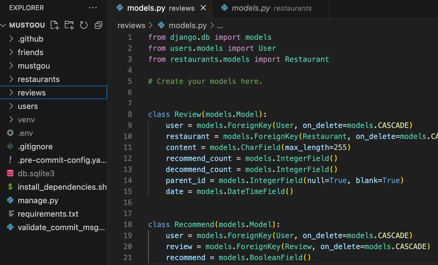 왼쪽 보면 프로젝트 안에 users, friends, restaurants, reviews 앱 만들었고,