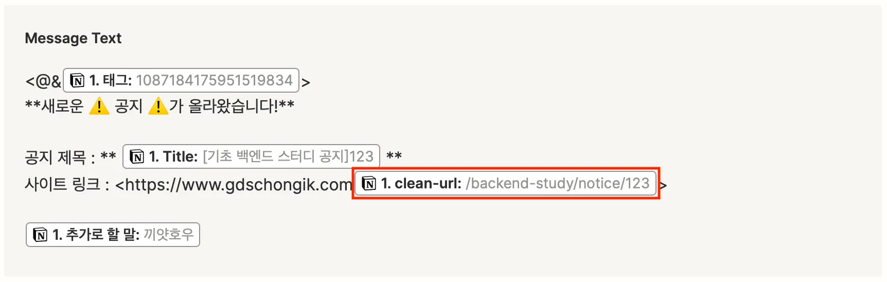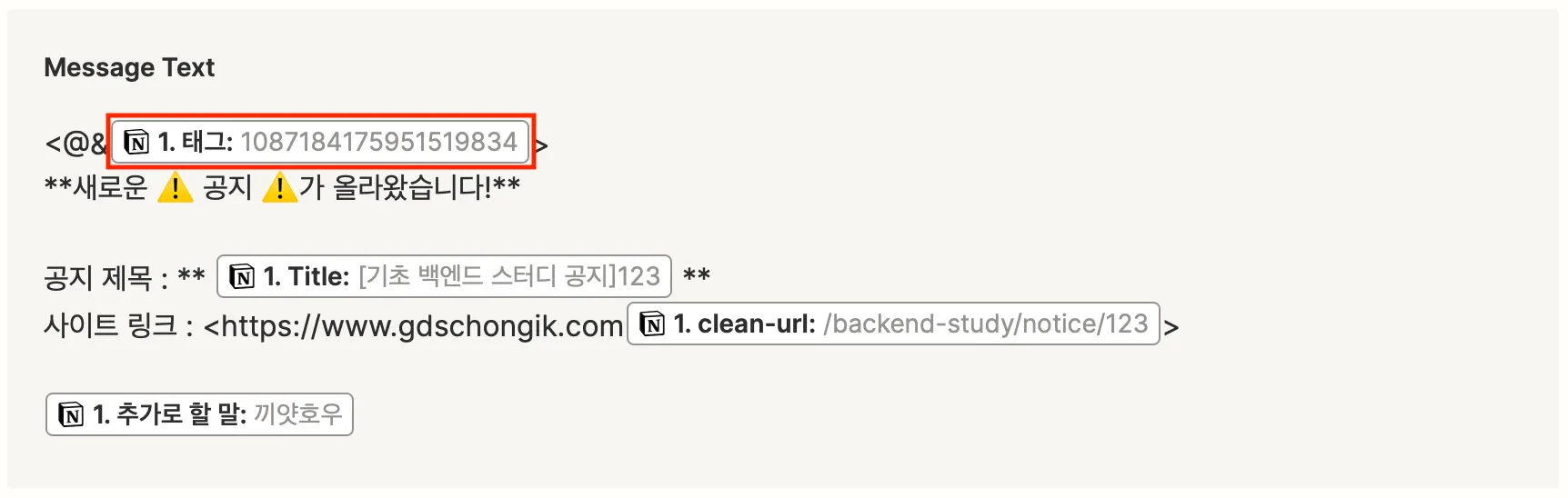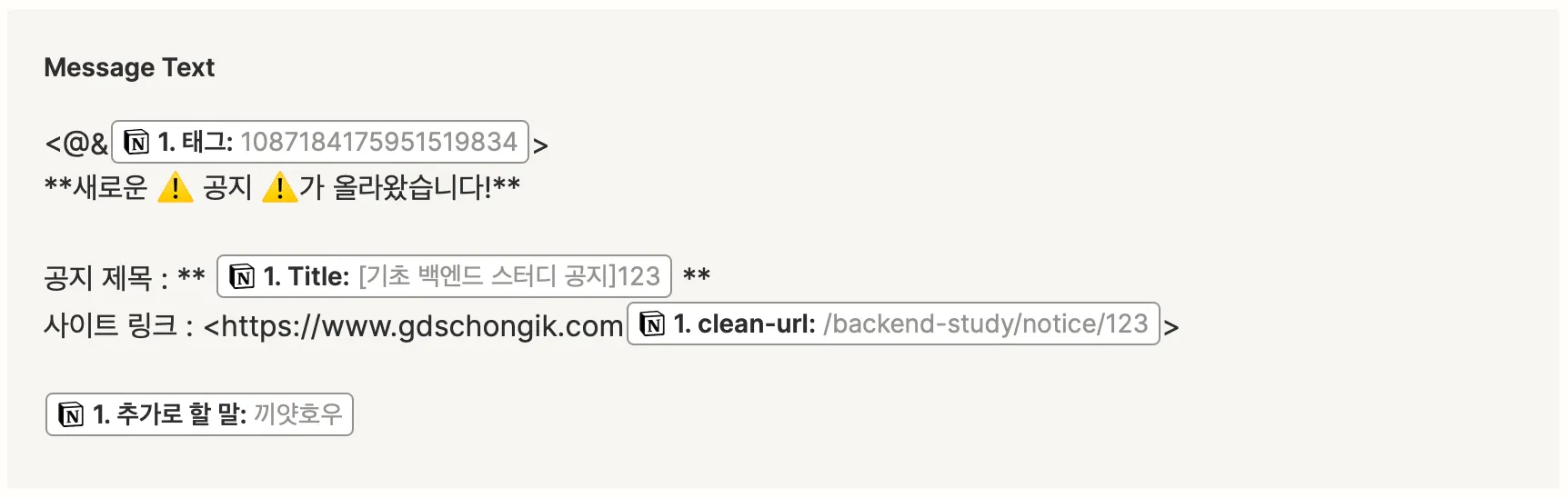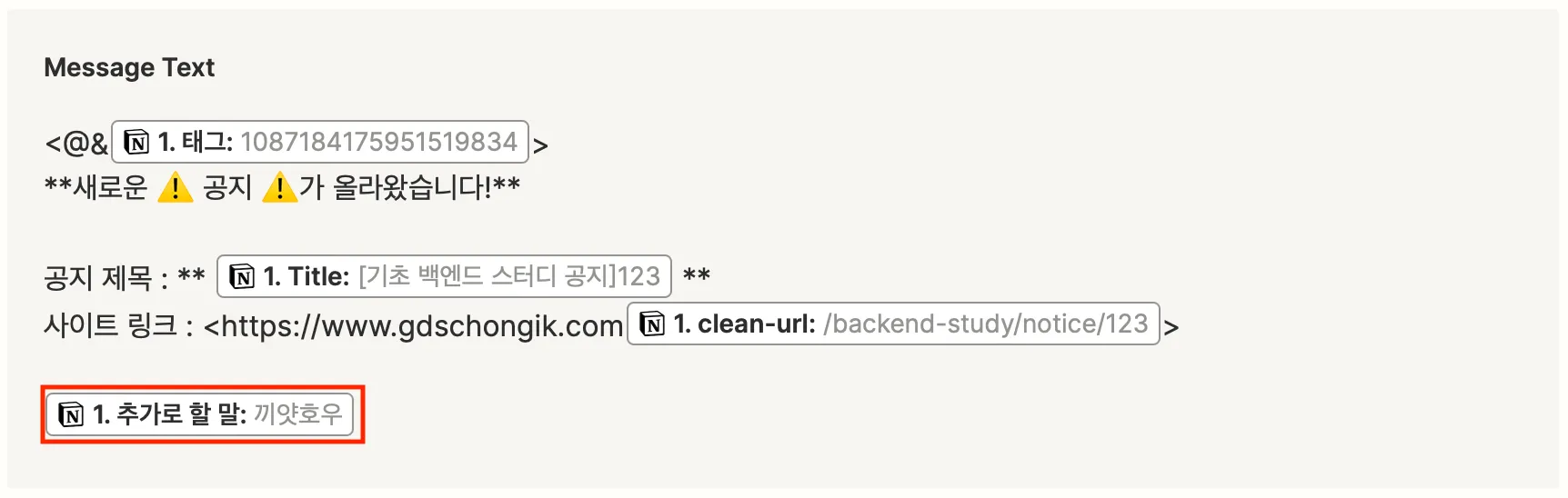 추가로 할 말 속성은 메세지의 하단에 공지의 내용을 요약하거나 멤버들에게 메세지 형태로 전하고 싶은 말로 들어가는 속성입니다.