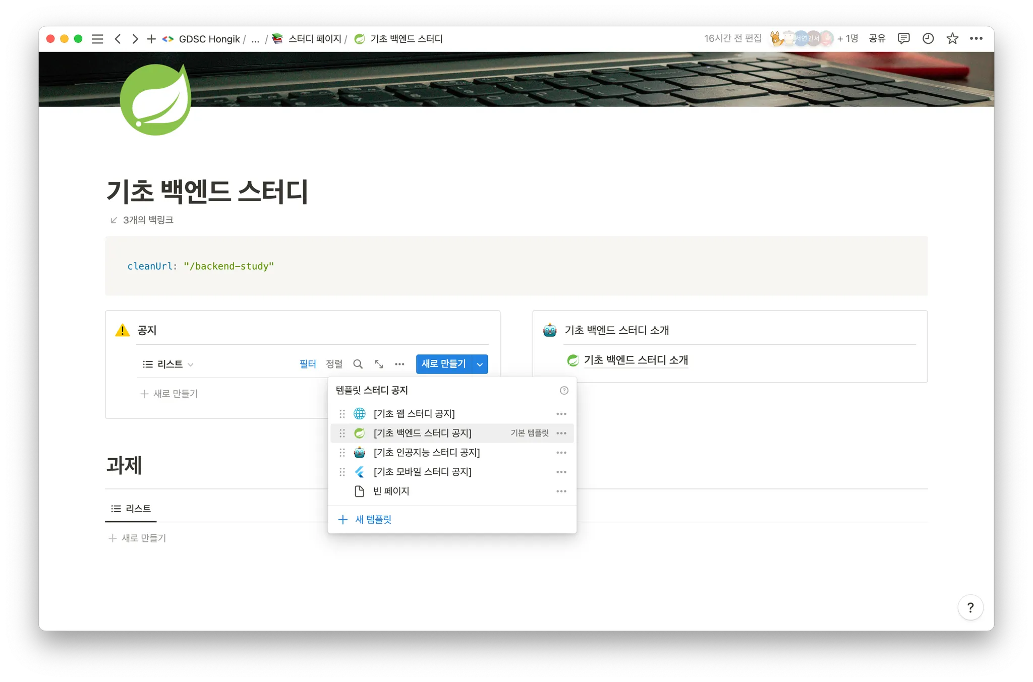 개별 스터디 페이지에서는 각 스터디에 맞기 기본 템플릿 설정이 되어있어