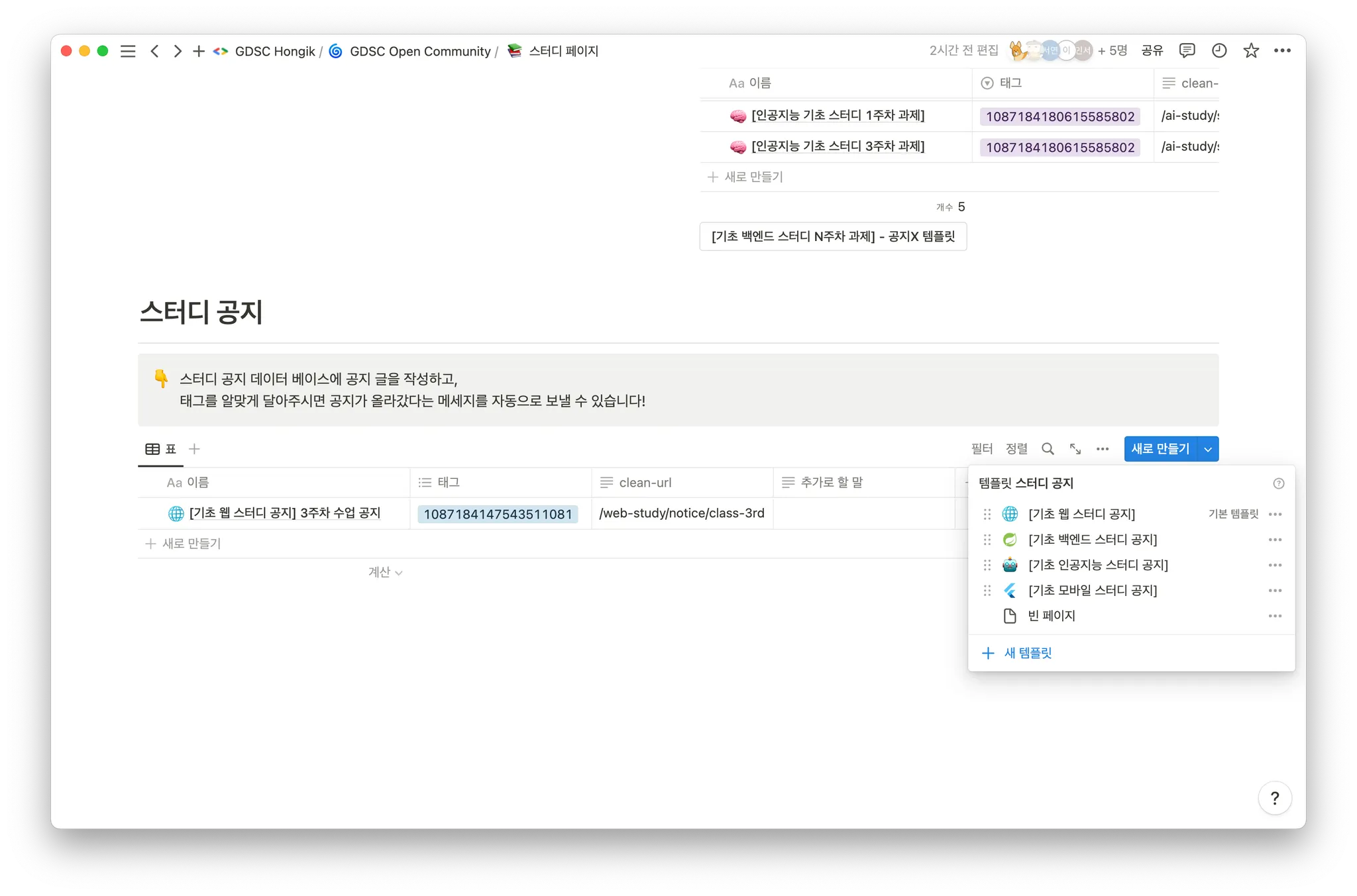 스터디 관리 페이지에서는 기본 템플릿이 기초 웹 스터디 공지 템플릿입니다.