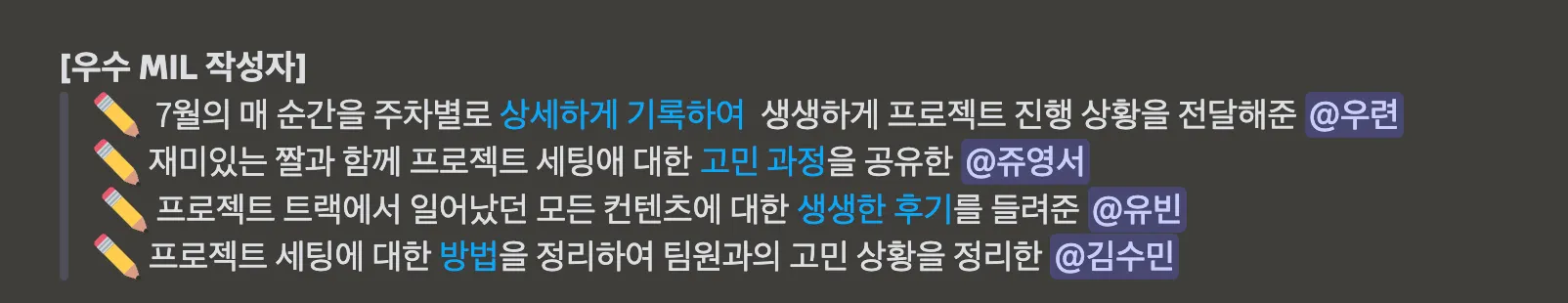 아무튼 이번 프로젝트는 이제 16일이면 끝입니다. 진짜 많은 성장, 고생을 했길 바랍니다.