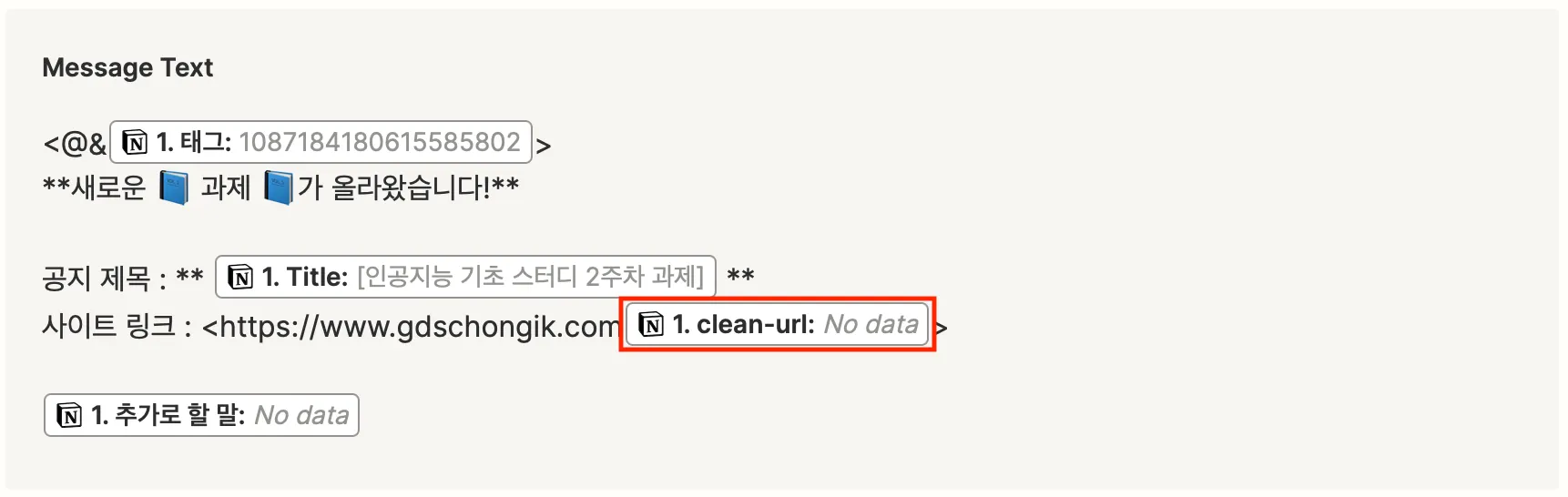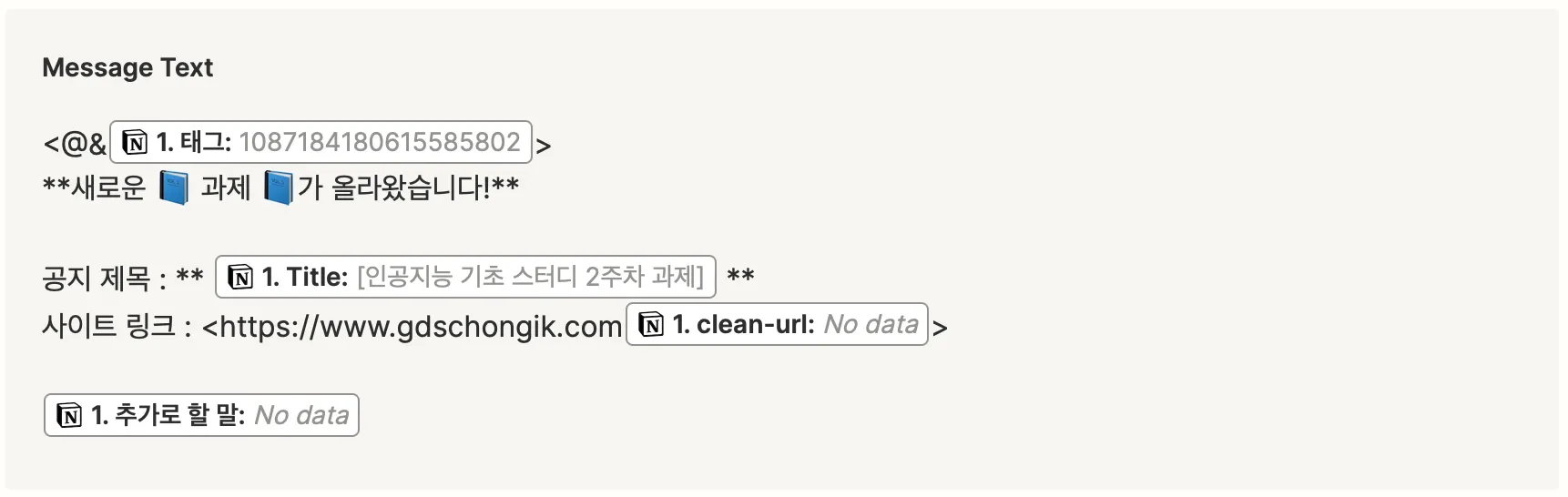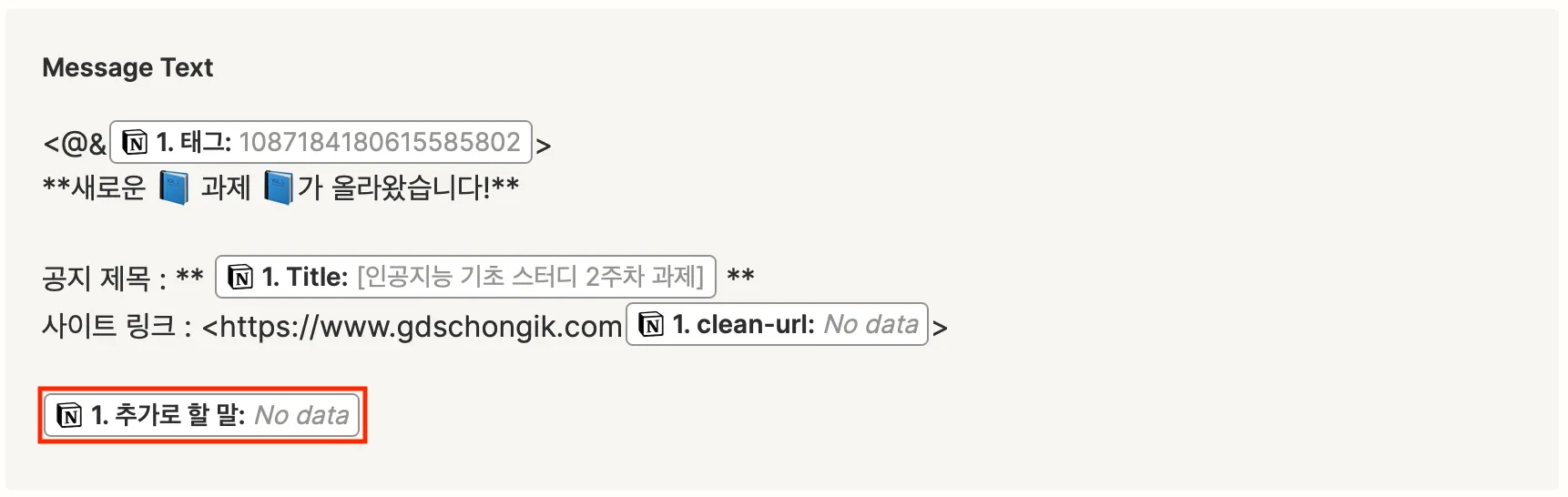 추가로 할 말 속성은 메세지의 하단에 공지의 내용을 요약하거나 멤버들에게 메세지 형태로 전하고 싶은 말로 들어가는 속성입니다.