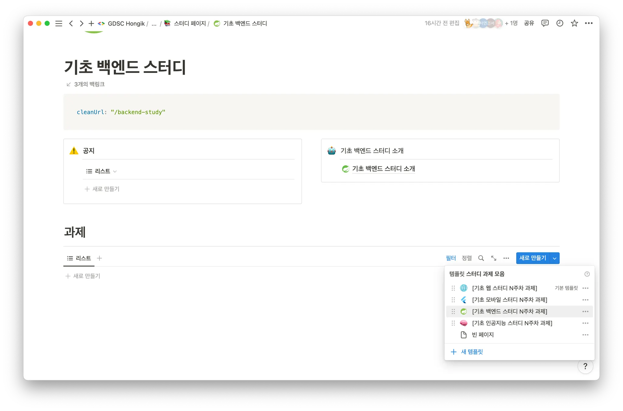 스터디 관리 페이지에서는 기본 템플릿이 기초 웹 스터디 공지 템플릿입니다.