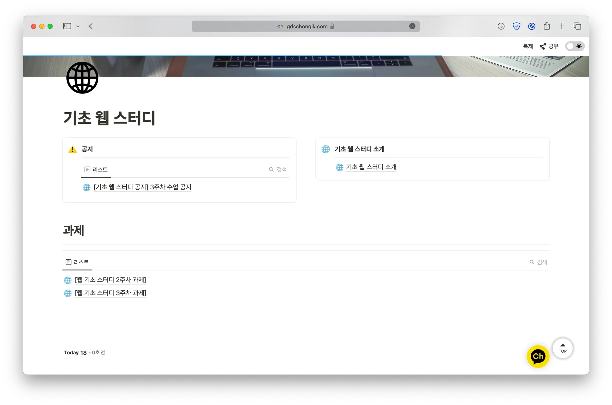 공지문을 올린게 확인이 되었다면 홈페이지에 접속해서 스터디 페이지로 이동하여 새로고침을 해줍니다.