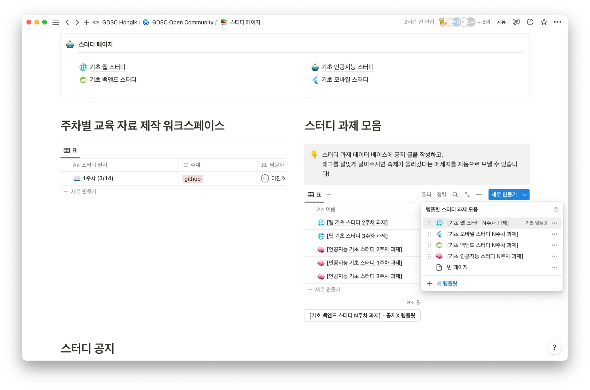 개별 스터디 페이지에서는 각 스터디에 맞기 기본 템플릿 설정이 되어있어