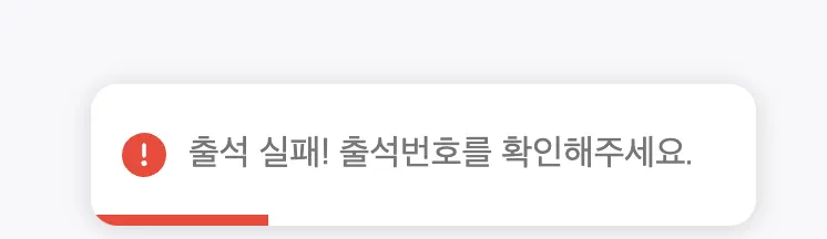 출석 번호가 다르면 위와 같은 알람이 보여요. 이럴 때는 멘토님에게 문의해주세요.