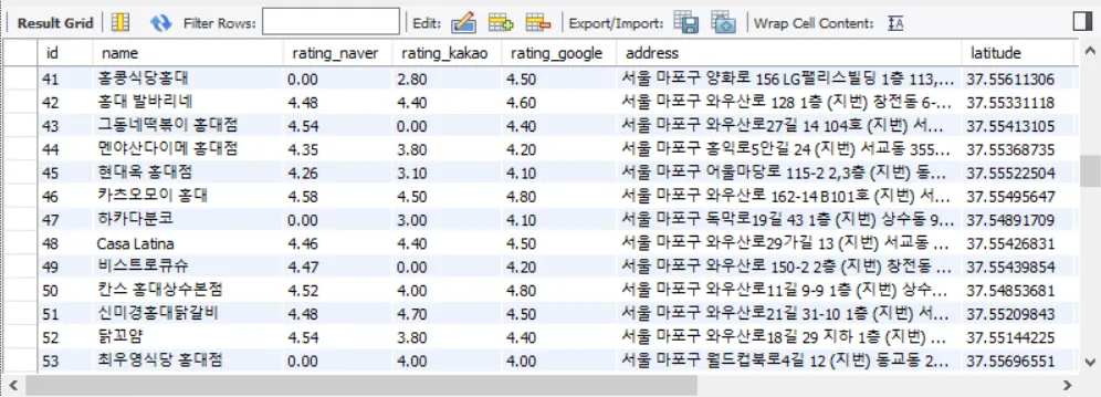 MySQL에 크롤링한 모든 식당이 들어갔습니다.