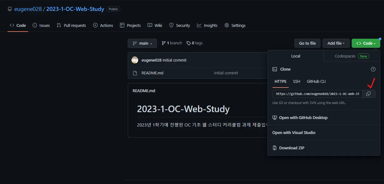저희가 만든 레포지토리를 local 컴퓨터에 clone(복사해오기)위해서 https 링크를 복사해와야 해요. 오른쪽 상단의 녹색 code 버튼을 누르면 해당 팝업창이 뜨게 되어요. clone 파트의 https 버튼을 클릭하고, 해당 레포지토리의 https 링크를 복사해옵시다.