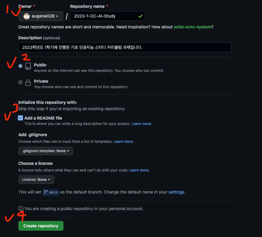 1번의 Repository name을 꼭 2023-1-OC-AI-Study로 설정해주시고, 2번의 공개 여부를 Public으로 설정해주세요. 이 두가지는 여러분이 과제를 잘 제출했는지 확인하기 위해서 꼭 지켜져야 하는 사항입니다.