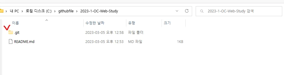 .git 파일은 저장소라고 하는데, 그의 역할은 2023-1-OC-AI-Study 폴더 안의 모든 파일을 추적하여, 트래킹해요. 그래서 해당 폴더에서 일어나는 모든 변경 내용을 저장하여 관리할 수 있도록 해주는 폴더예요. 이 폴더를 지우게 되면 더이상 깃으로 local 폴더의 변경사항을 추적할 수 없으니 절대 절대로 지우지 않도록 해요!