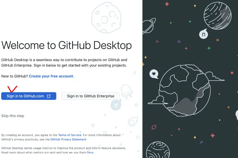 아이디와 비밀번호를 치고 github 아이디를 이용하여 github Desktop에 로그인하도록 합시다. 새로운 창이 뜨지 않고 github Desktop 내에서 github 아이디와 비밀번호를 입력하라고 하면 그렇게 해주시고, git configure 과정에 등장하는 자신의 사용자명과 이메일을 확인한 이후, 다음 화면으로 넘어가 주세요!