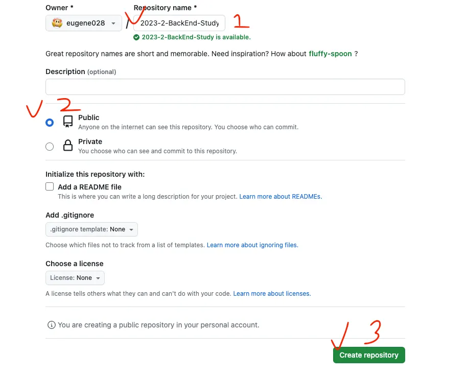 1번의 Repository name을 꼭 2023-2-BackEnd-Study로 설정해주시고, 2번의 공개 여부를 Public으로 설정해주세요. 이  두가지는 여러분이 과제를 잘 제출했는지 확인하기 위해서 꼭 지켜져야 하는 사항입니다.