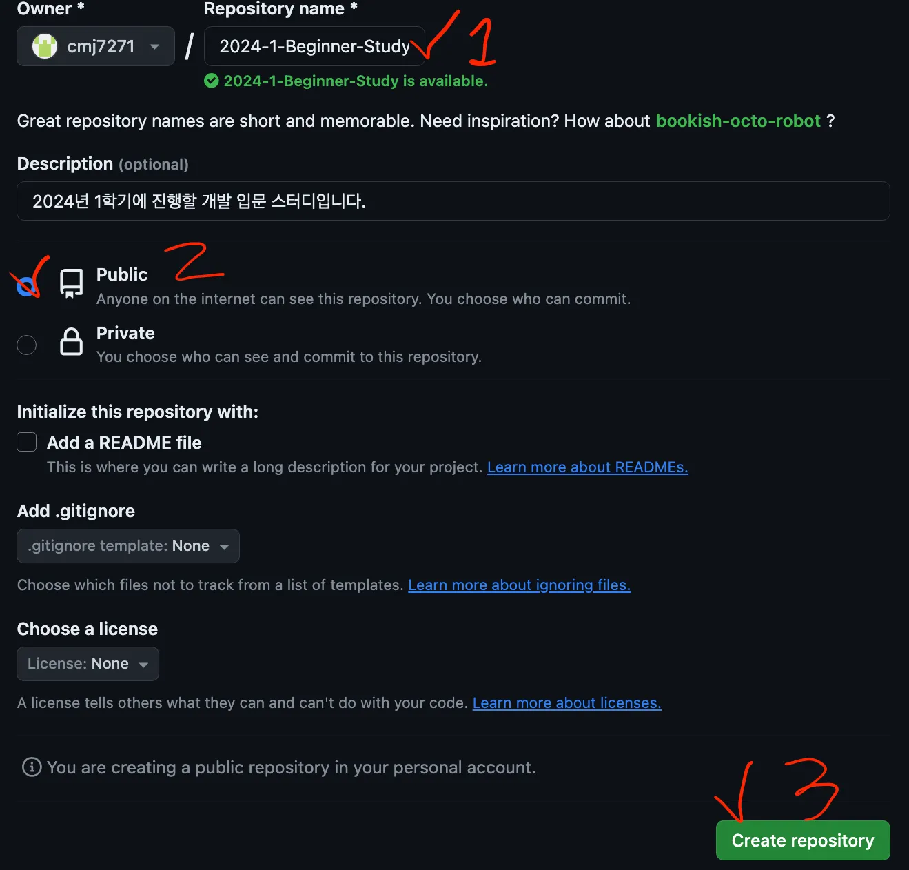 1번의 Repository name을 꼭 2024-1-Beginner-Study로 설정해주시고,