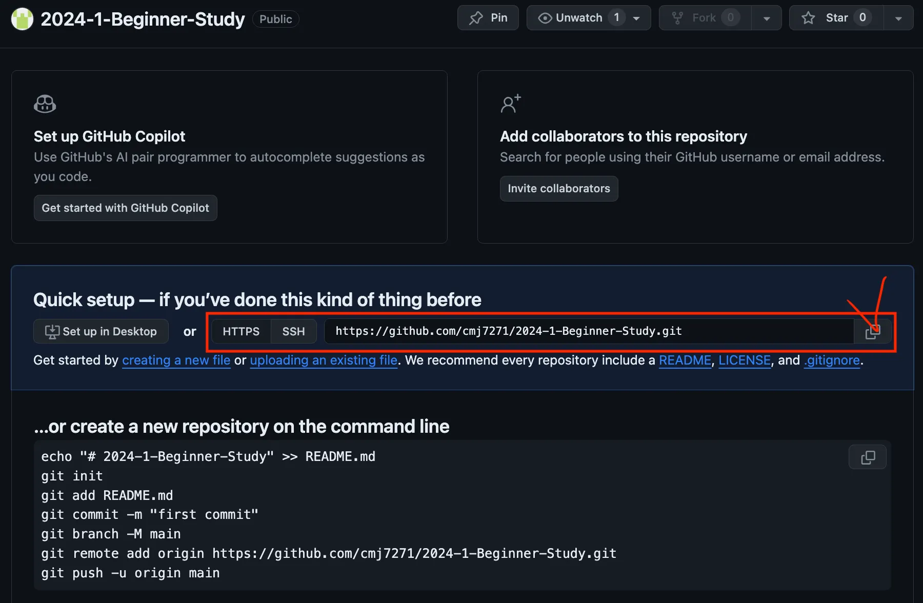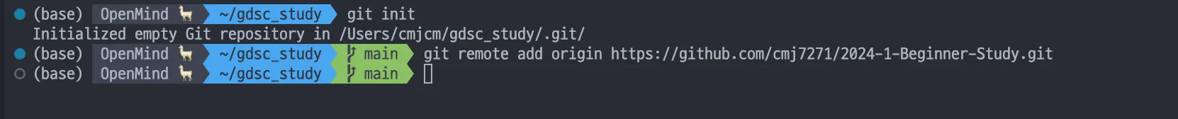 git remote add origin https://github.com/{github 아이디 ex.cmj7271}/2024-1-Beginner-Study.git