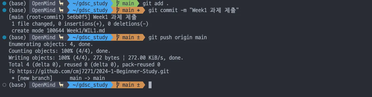 1주차 과제의 WIL을 제출해볼게요. 먼저 과제를 열심히 gdsc_study라는 폴더 안에 수행합니다!