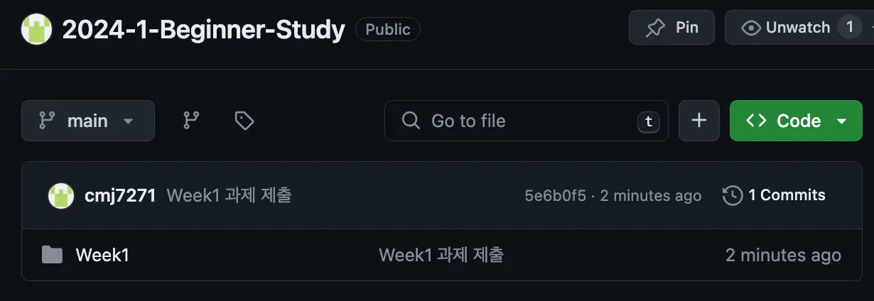 짜잔! 이렇게 하면 수행한 과제가 나의 원격 레포지토리에 잘 업로드된것을 확인할 수 있지요
