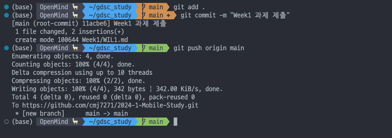 1주차 과제의 WIL을 제출해볼게요. 먼저 과제를 열심히 gdsc_study라는 폴더 안에 수행합니다!