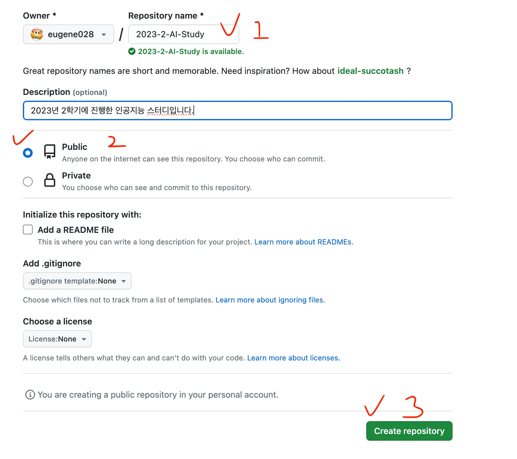 1번의 Repository name을 꼭 2023-2-AI-Study로 설정해주시고, 2번의 공개 여부를 Public으로 설정해주세요. 이 두가지는 여러분이 과제를 잘 제출했는지 확인하기 위해서 꼭 지켜져야 하는 사항입니다.