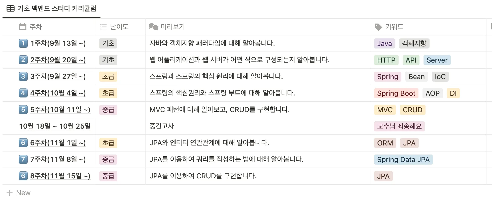 기존 8주차에 해당하는 JUnit 부분을 JPA 부분으로 대체하여 더 천천히 진행할 예정입니다.