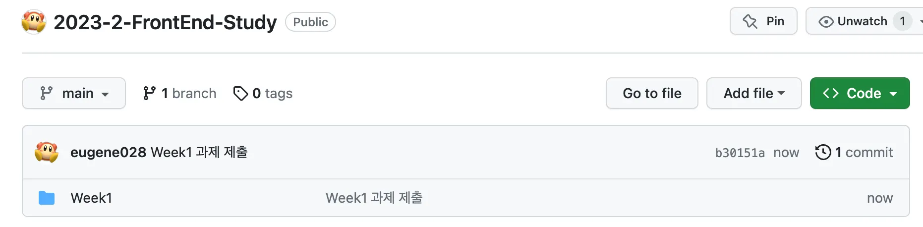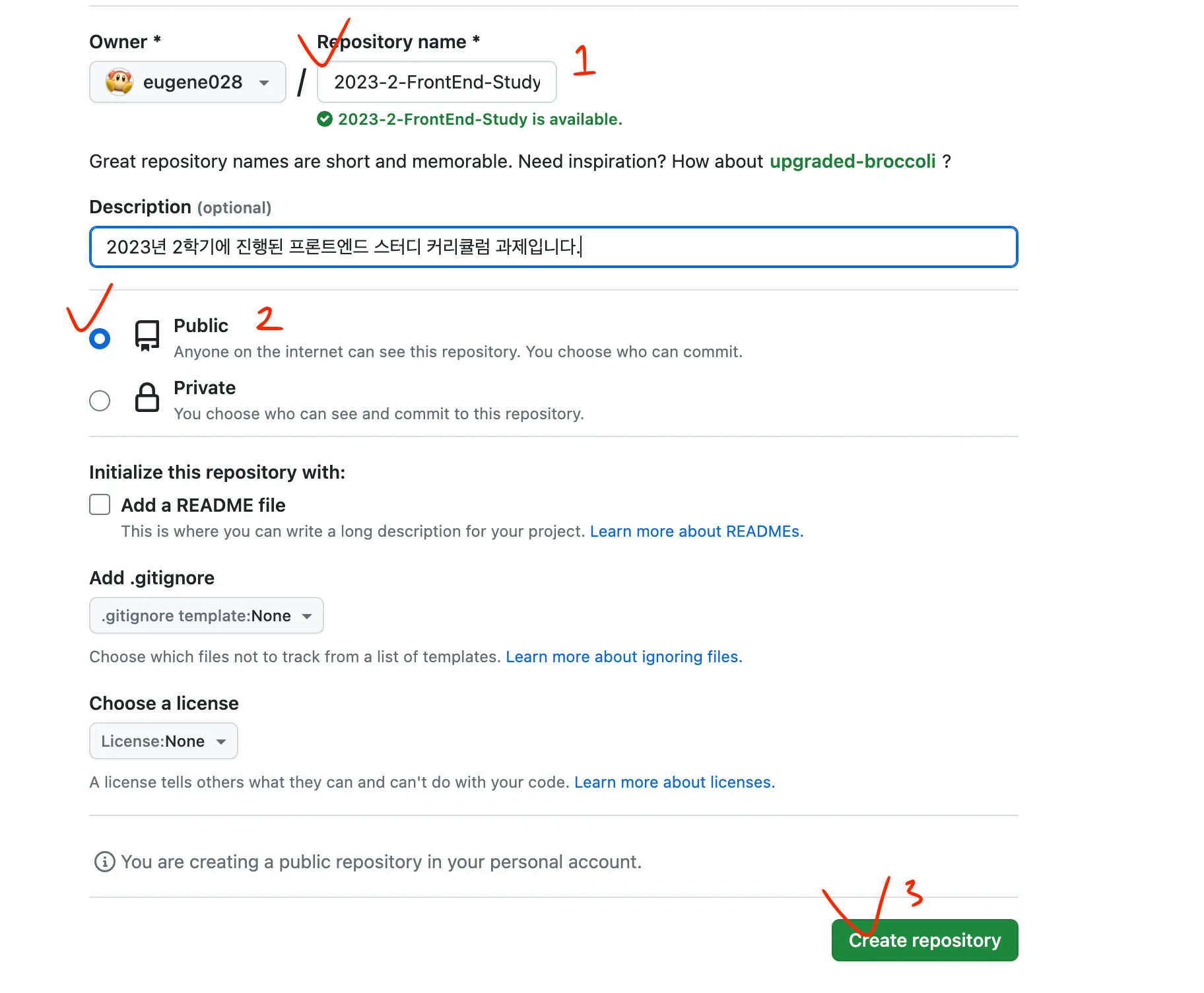 1번의 Repository name을 꼭 2023-2-FrontEnd-Study로 설정해주시고, 2번의 공개 여부를 Public으로 설정해주세요. 이 두가지는 여러분이 과제를 잘 제출했는지 확인하기 위해서 꼭 지켜져야 하는 사항입니다.(오탈자를 꼭 확인해주세요!)