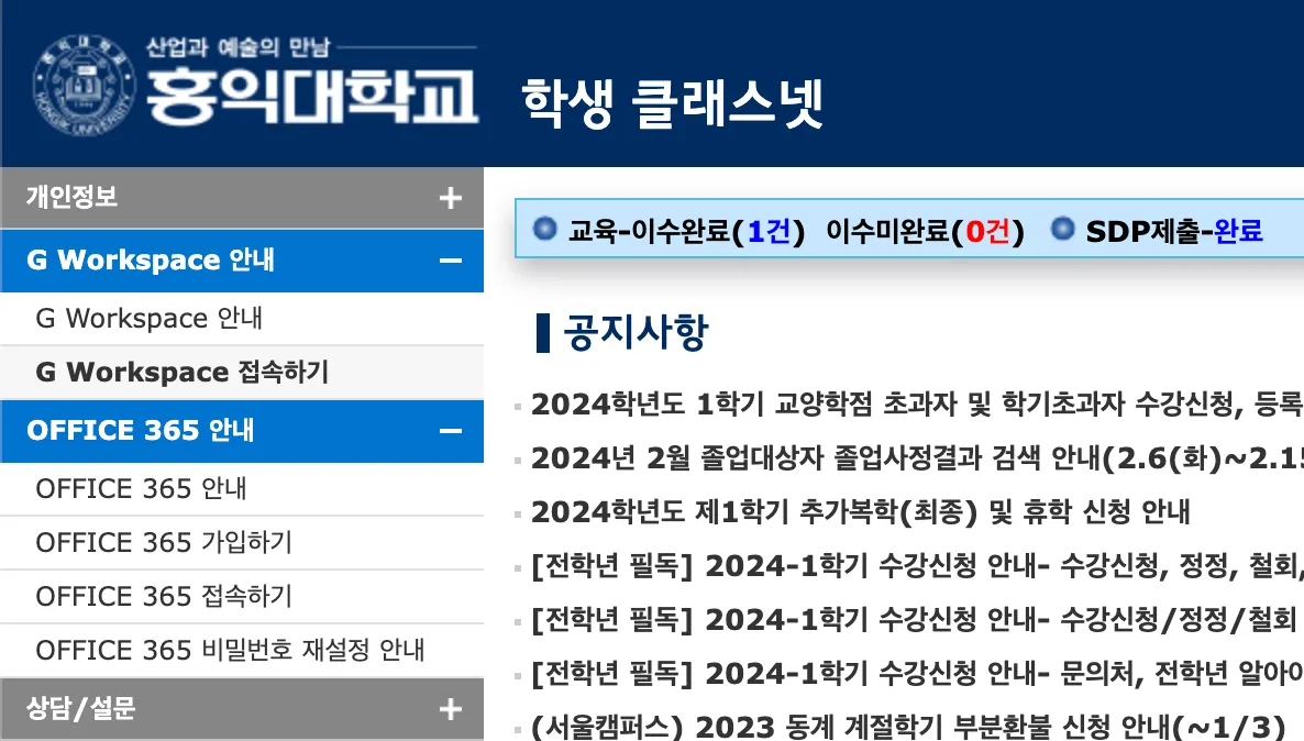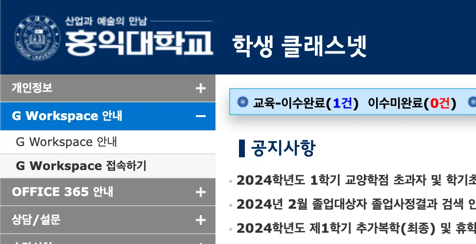 위 학생 클래스넷에서 우리에게 필요한건 G-suite이니 좌측 탭에 있는 G Workspace 안내 - G Workspace 접속하기를 통해 아래 화면으로 접속해주세요.
