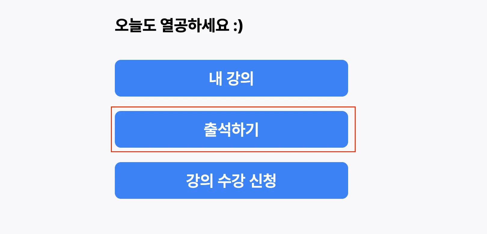 수강 신청 승인이 완료된 상태에서만 출석을 할 수 있어요. 출석하기 버튼을 누르고, 수강중인 강의를 클릭해주세요.