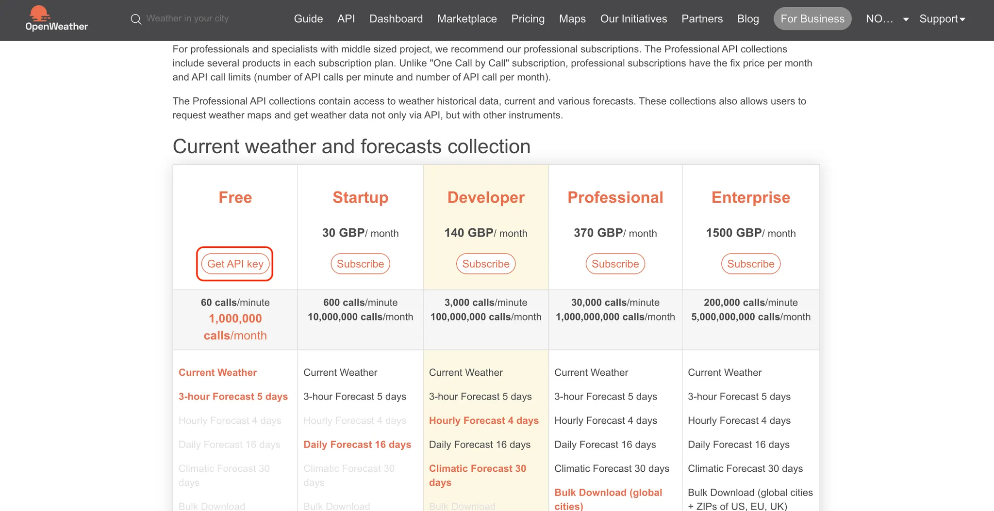 눌러서 들어간 페이지를 조금만 내리면 요금표가 나오는데 여기서 Free 요금제의 Get API Key를 눌러줍니다. ▼