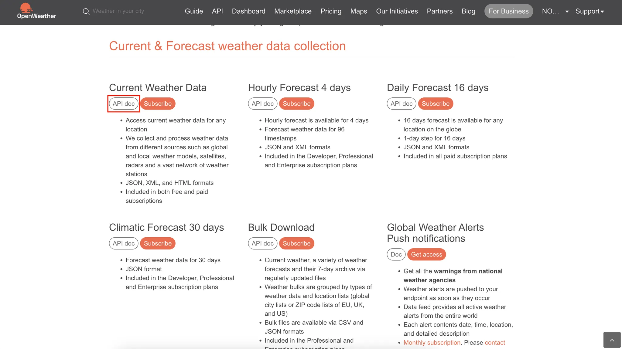 아까 선택했떤 Current Weather Data의 Subscribe 옆에 API doc 버튼이 있습니다.