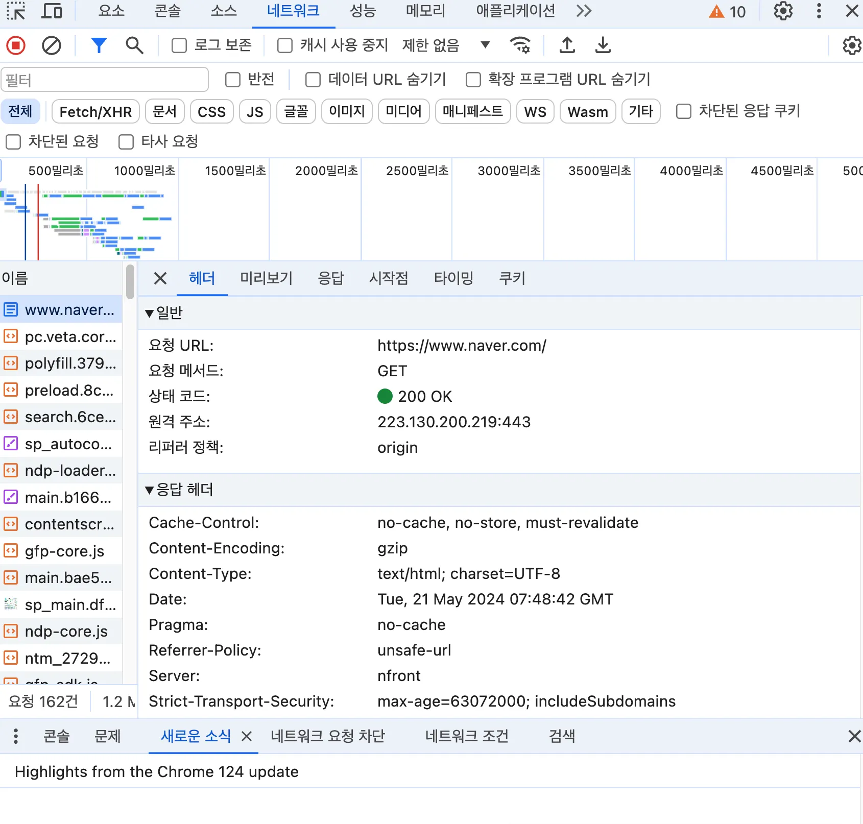 naver.com에서 개발자 도구를 통해 메인 화면 GET 요청이 성공한 화면